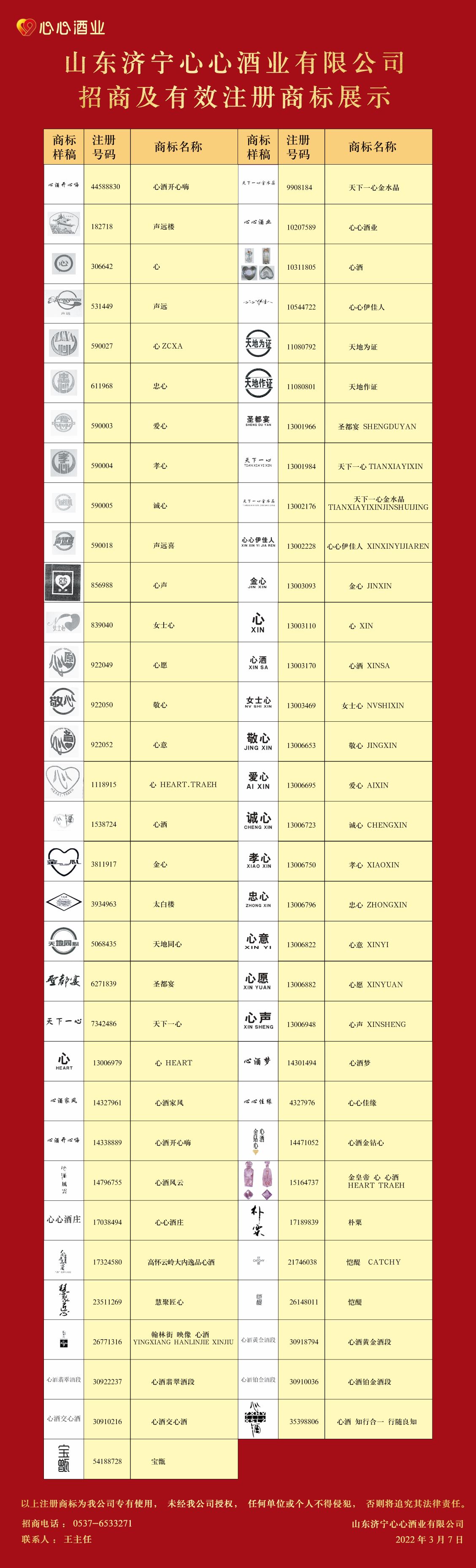 山東濟(jì)寧心心酒業(yè)有限公司招商及有效注冊商標(biāo)展示